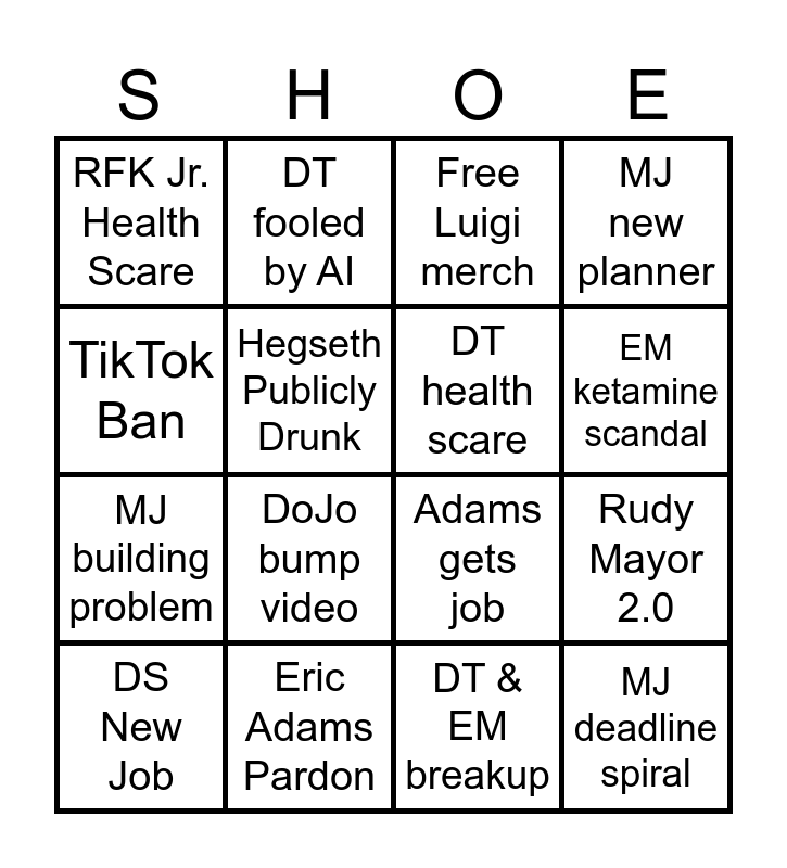 This bingo card has 16 words: DS New Job, Eric Adams Pardon, Free Luigi merch, MJ new planner, TikTok Ban, DT fooled by AI, Adams gets job, Rudy Mayor 2.0, RFK Jr. Health Scare, Hegseth Publicly Drunk, DT & EM breakup, EM ketamine scandal, MJ building problem, DoJo bump video, DT health scare and MJ deadline spiral.