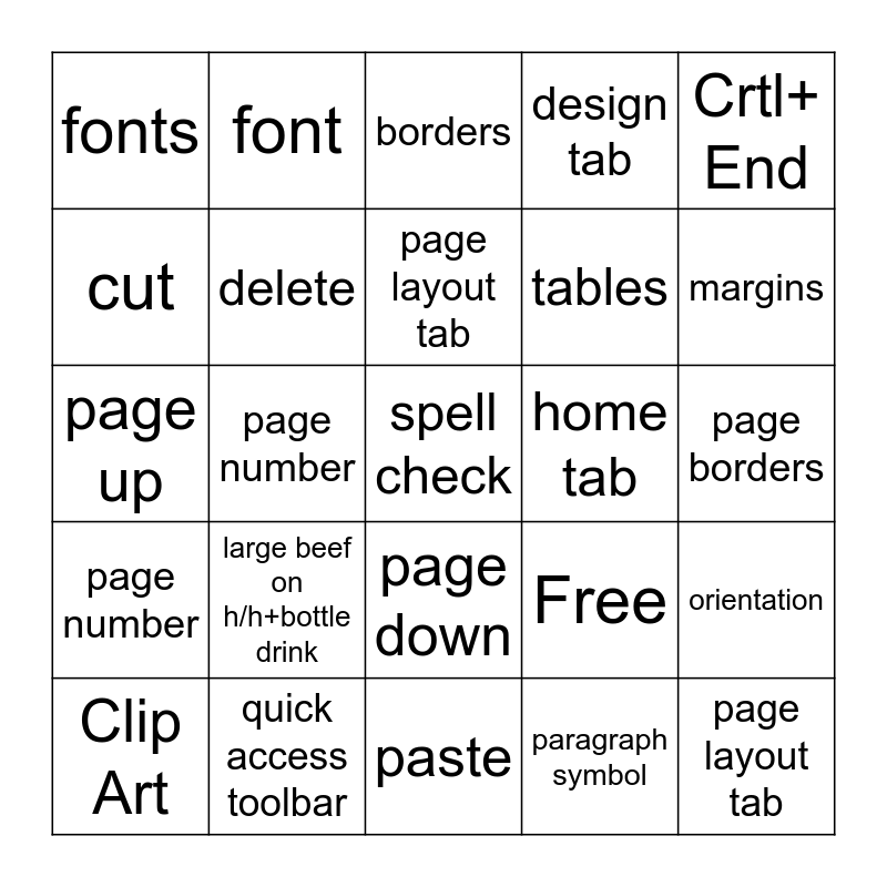 This bingo card has 25 words: large beef on h/h+bottle drink, paste, page layout tab, Clip Art, Crtl+ End, fonts, cut, font, home tab, page down, tables, page up, Free, orientation, delete, page layout tab, page borders, borders, margins, page number, spell check, quick access toolbar, page number, design tab and paragraph symbol.