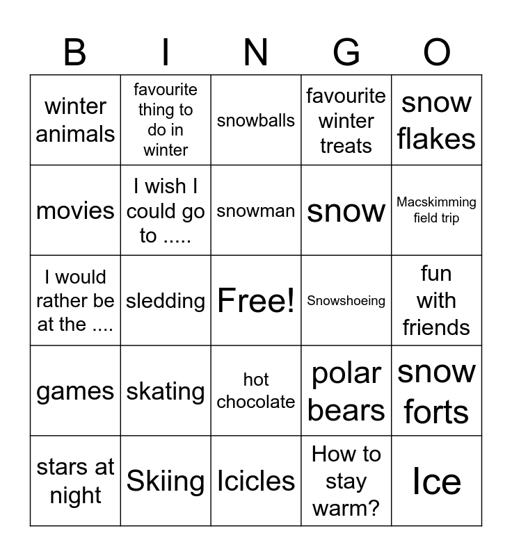 This bingo card has a free space and 24 words: skating, Skiing, snowman, stars at night, snow flakes, winter animals, movies, favourite thing to do in winter, Snowshoeing, hot chocolate, snow, I would rather be at the ...., polar bears, snow forts, I wish I could go to ....., How to stay warm?, fun with friends, snowballs, Macskimming field trip, sledding, Ice, games, favourite winter treats and Icicles.