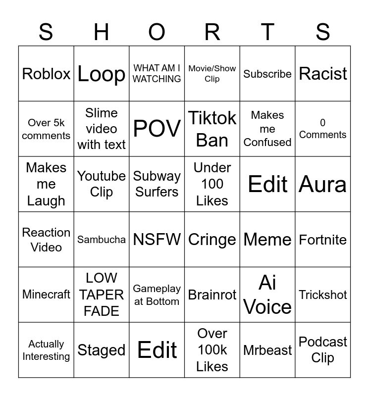 This bingo card has 36 words: Brainrot, Gameplay at Bottom, Over 100k Likes, Over 5k comments, Reaction Video, Under 100 Likes, Slime video with text, Edit, Subscribe, Ai Voice, 0 Comments, Movie/Show Clip, Trickshot, Youtube Clip, Tiktok Ban, Roblox, Minecraft, Edit, Makes me Laugh, WHAT AM I WATCHING, Subway Surfers, Sambucha, Cringe, NSFW, Meme, Loop, Makes me Confused, Staged, POV, Racist, Podcast Clip, Actually Interesting, Fortnite, Aura, LOW TAPER FADE and Mrbeast.