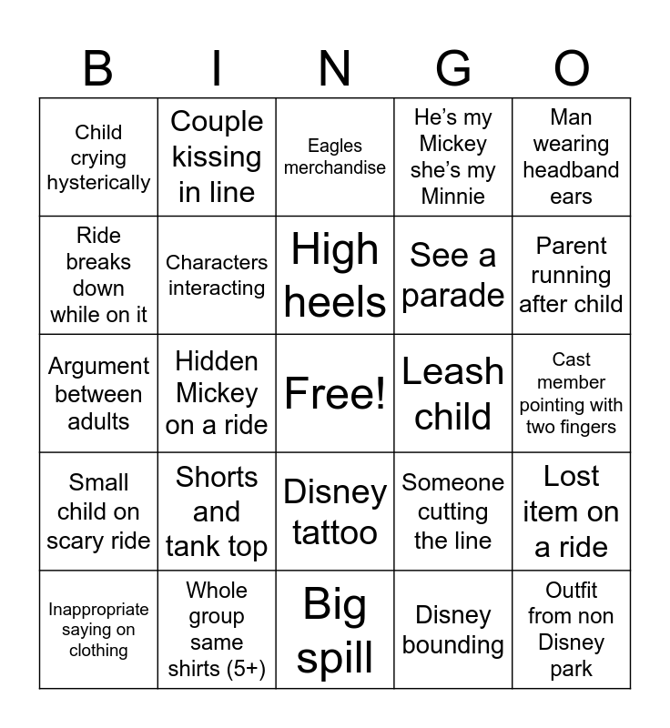 This bingo card has a free space and 24 words: Shorts and tank top, Whole group same shirts (5+), High heels, Inappropriate saying on clothing, Man wearing headband ears, Child crying hysterically, Ride breaks down while on it, Couple kissing in line, Leash child, Disney tattoo, See a parade, Argument between adults, Someone cutting the line, Lost item on a ride, Characters interacting, Disney bounding, Cast member pointing with two fingers, Eagles merchandise, Parent running after child, Hidden Mickey on a ride, Outfit from non Disney park, Small child on scary ride, He’s my Mickey she’s my Minnie and Big spill.