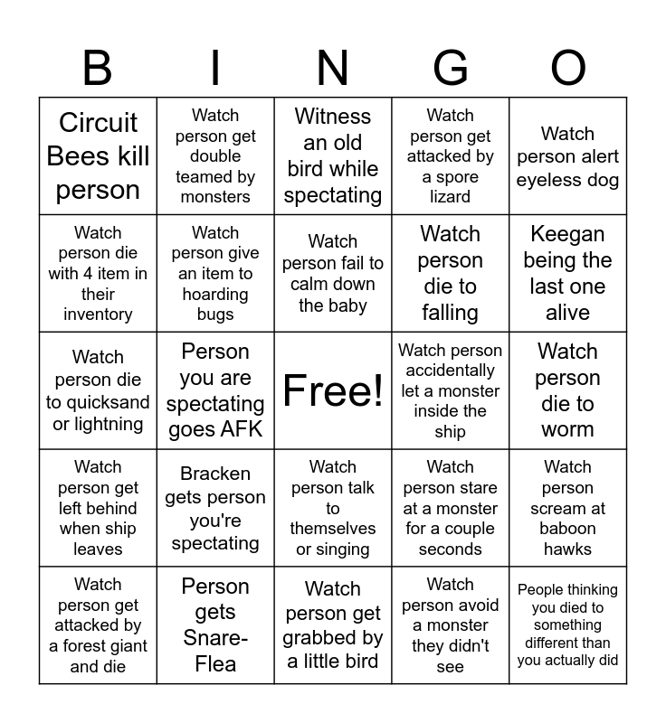 This bingo card has a free space and 24 words: Bracken gets person you're spectating, Person gets Snare-Flea, Watch person fail to calm down the baby, Watch person get attacked by a forest giant and die, Watch person alert eyeless dog, Circuit Bees kill person, Watch person die with 4 item in their inventory, Watch person get double teamed by monsters, Watch person accidentally let a monster inside the ship, Watch person talk to themselves or singing, Watch person die to falling, Watch person die to quicksand or lightning, Watch person stare at a monster for a couple seconds, Watch person scream at baboon hawks, Watch person give an item to hoarding bugs, Watch person avoid a monster they didn't see, Watch person die to worm, Witness an old bird while spectating, Keegan being the last one alive, Person you are spectating goes AFK, People thinking you died to something different than you actually did, Watch person get left behind when ship leaves, Watch person get attacked by a spore lizard and Watch person get grabbed by a little bird.