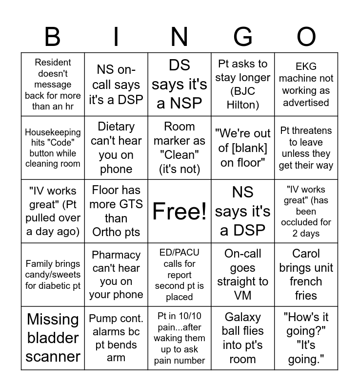 This bingo card has a free space and 24 words: Missing bladder scanner, Pharmacy can't hear you on your phone, Room marker as "Clean" (it's not), Galaxy ball flies into pt's room, EKG machine not working as advertised, Resident doesn't message back for more than an hr, NS on-call says it's a DSP, DS says it's a NSP, NS says it's a DSP, "IV works great" (has been occluded for 2 days, "IV works great" (Pt pulled over a day ago), Dietary can't hear you on phone, On-call goes straight to VM, Carol brings unit french fries, Housekeeping hits "Code" button while cleaning room, Pump cont. alarms bc pt bends arm, Pt in 10/10 pain...after waking them up to ask pain number, Pt asks to stay longer (BJC Hilton), Pt threatens to leave unless they get their way, Family brings candy/sweets for diabetic pt, Floor has more GTS than Ortho pts, ED/PACU calls for report second pt is placed, "We're out of [blank] on floor" and "How's it going?" "It's going.".