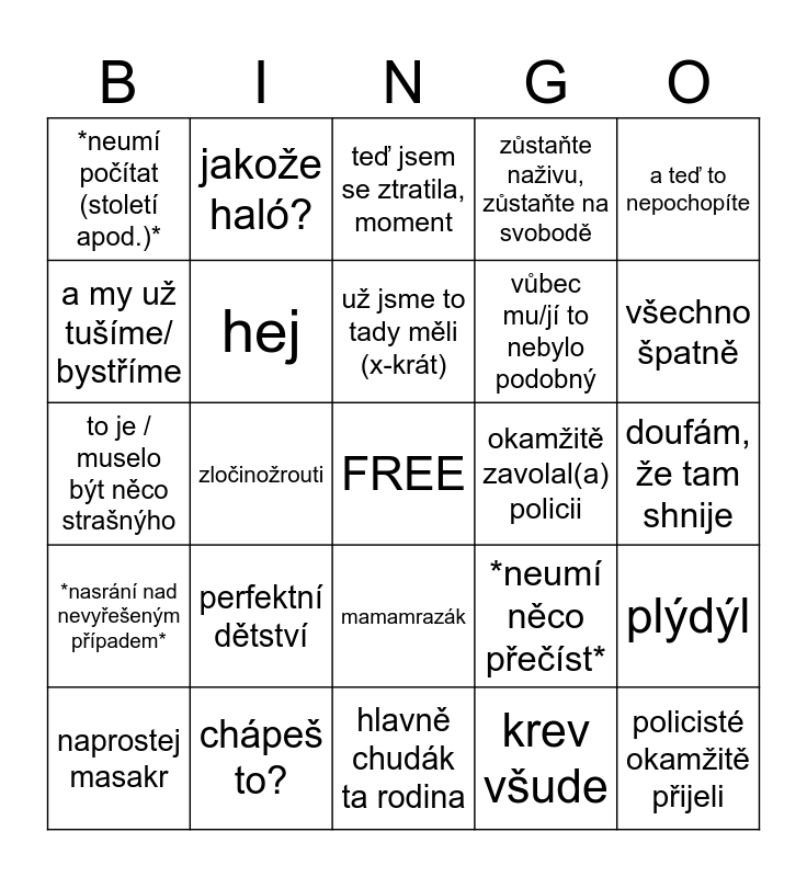 This bingo card has a free space and 24 words: perfektní dětství, chápeš to?, už jsme to tady měli (x-krát), naprostej masakr, a teď to nepochopíte, *neumí počítat (století apod.)*, a my už tušíme/ bystříme, jakože haló?, okamžitě zavolal(a) policii, mamamrazák, vůbec mu/jí to nebylo podobný, to je / muselo být něco strašnýho, *neumí něco přečíst*, plýdýl, hej, krev všude, doufám, že tam shnije, teď jsem se ztratila, moment, všechno špatně, zločinožrouti, policisté okamžitě přijeli, *nasrání nad nevyřešeným případem*, zůstaňte naživu, zůstaňte na svobodě and hlavně chudák ta rodina.