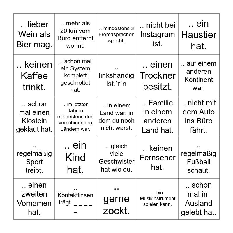 This bingo card has 26 words: .. gleich viele Geschwister hat wie du., .. ein Musikinstrument spielen kann., .. linkshändig ist.`r`n, .. Kontaktlinsen trägt. _ _ _ _ _, .. ein Haustier hat., .. lieber Wein als Bier mag., .. keinen Kaffee trinkt., .. mehr als 20 km vom Büro entfernt wohnt., .. nicht mit dem Auto ins Büro fährt., .. keinen Fernseher hat., .. einen Trockner besitzt., .. schon mal einen Klostein geklaut hat., .. regelmäßig Fußball schaut., .. einen zweiten Vornamen hat., .. im letzten Jahr in mindestens drei verschiedenen Ländern war., .. Katzen mehr mag als Hunde., .. nicht bei Instagram ist., .. regelmäßig Sport treibt., .. mindestens 3 Fremdsprachen spricht., .. in einem Land war, in dem du noch nicht warst., .. auf einem anderen Kontinent war., .. gerne zockt., .. Familie in einem anderen Land hat., .. ein Kind hat., .. schon mal ein System komplett geschrottet hat. and .. schon mal im Ausland gelebt hat..