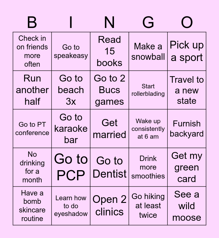 This bingo card has a free space and 24 words: Go to PCP, Learn how to do eyeshadow, Go to 2 Bucs games, Have a bomb skincare routine, Pick up a sport, Check in on friends more often, Run another half, Go to speakeasy, Wake up consistently at 6 am, Go to Dentist, Start rollerblading, Go to PT conference, Drink more smoothies, Get my green card, Go to beach 3x, Go hiking at least twice, Furnish backyard, Read 15 books, Travel to a new state, Go to karaoke bar, See a wild moose, No drinking for a month, Make a snowball and Open 2 clinics.