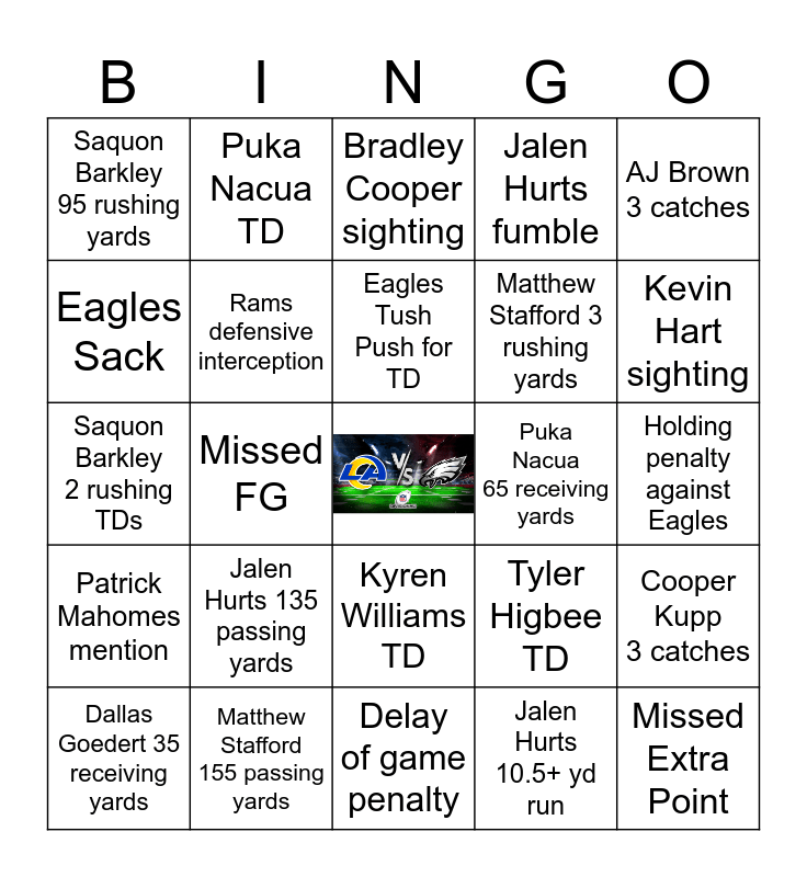 This bingo card has a free space and 24 words: Jalen Hurts 135 passing yards, Matthew Stafford 155 passing yards, Eagles Tush Push for TD, Dallas Goedert 35 receiving yards, AJ Brown 3 catches, Saquon Barkley 95 rushing yards, Eagles Sack, Puka Nacua TD, Puka Nacua 65 receiving yards, Kyren Williams TD, Matthew Stafford 3 rushing yards, Saquon Barkley 2 rushing TDs, Tyler Higbee TD, Cooper Kupp 3 catches, Rams defensive interception, Jalen Hurts 10.5+ yd run, Holding penalty against Eagles, Bradley Cooper sighting, Kevin Hart sighting, Missed FG, Missed Extra Point, Patrick Mahomes mention, Jalen Hurts fumble and Delay of game penalty.
