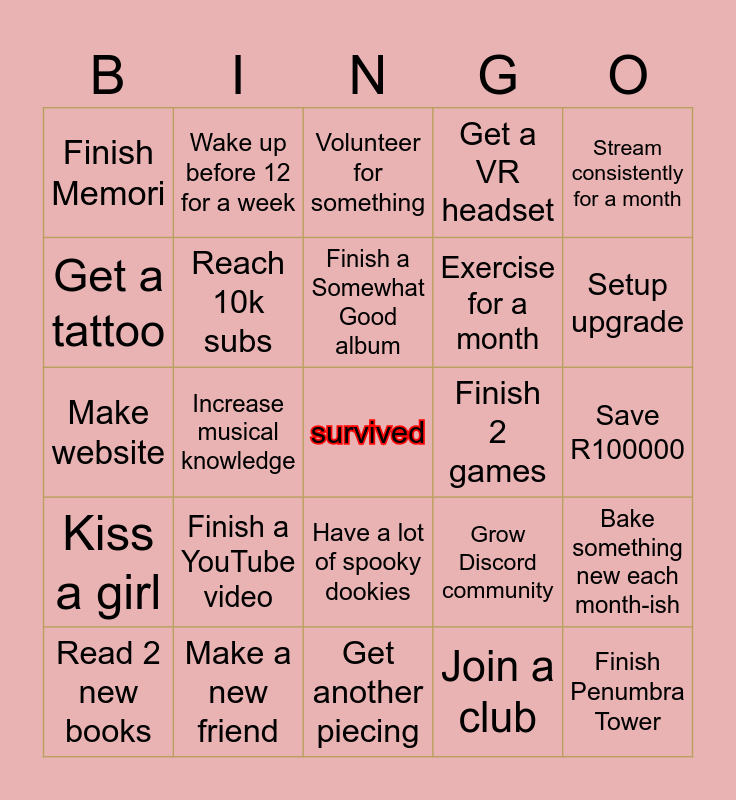 This bingo card has a free space and 24 words: Finish a YouTube video, Make a new friend, Finish a Somewhat Good album, Read 2 new books, Stream consistently for a month, Finish Memori, Get a tattoo, Wake up before 12 for a week, Finish 2 games, Have a lot of spooky dookies, Exercise for a month, Make website, Grow Discord community, Bake something new each month-ish, Reach 10k subs, Join a club, Save R100000, Volunteer for something, Setup upgrade, Increase musical knowledge, Finish Penumbra Tower, Kiss a girl, Get a VR headset and Get another piecing.