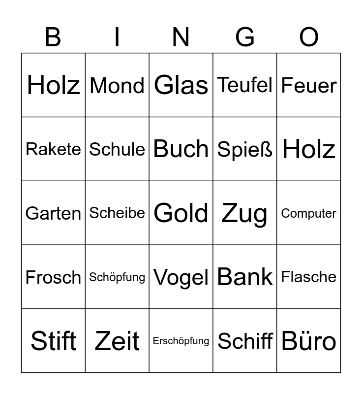 This bingo card has 25 words: Schöpfung, Erschöpfung, Buch, Stift, Feuer, Holz, Rakete, Mond, Zug, Vogel, Spieß, Garten, Bank, Flasche, Schule, Büro, Computer, Glas, Holz, Scheibe, Gold, Zeit, Frosch, Teufel and Schiff.