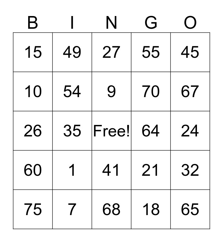 This bingo card has a free space and 24 words: 1, 7, 9, 75, 45, 15, 10, 49, 64, 41, 70, 26, 21, 32, 54, 18, 24, 27, 67, 35, 65, 60, 55 and 68.