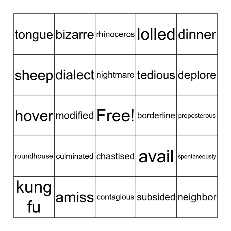 This bingo card has a free space and 24 words: culminated, amiss, nightmare, kung fu, dinner, tongue, sheep, bizarre, borderline, chastised, tedious, hover, avail, spontaneously, dialect, subsided, preposterous, rhinoceros, deplore, modified, neighbor, roundhouse, lolled and contagious.