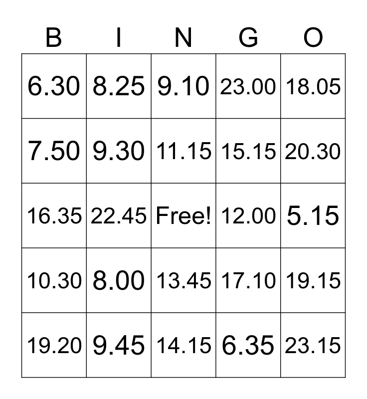 This bingo card has a free space and 24 words: 8.00, 9.45, 11.15, 19.20, 18.05, 6.30, 7.50, 8.25, 12.00, 13.45, 15.15, 16.35, 17.10, 19.15, 9.30, 6.35, 5.15, 9.10, 20.30, 22.45, 23.15, 10.30, 23.00 and 14.15.