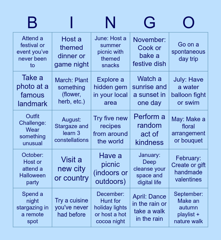 This bingo card has a free space and 24 words: Visit a new city or country, Try a cuisine you've never had before, Explore a hidden gem in your local area, Spend a night stargazing in a remote spot, Go on a spontaneous day trip, Attend a festival or event you’ve never been to, Take a photo at a famous landmark, Host a themed dinner or game night, Perform a random act of kindness, Have a picnic (indoors or outdoors), Watch a sunrise and a sunset in one day, Outfit Challenge: Wear something unusual, January: Deep cleanse your space and digital life, February: Create or gift handmade valentines, March: Plant something (flower, herb, etc.), April: Dance in the rain or take a walk in the rain, May: Make a floral arrangement or bouquet, June: Host a summer picnic with themed snacks, July: Have a water balloon fight or swim, August: Stargaze and learn 3 constellations, September: Make an autumn playlist + nature walk, October: Host or attend a Halloween party, November: Cook or bake a festive dish and December: Hunt for holiday lights or host a hot cocoa night.