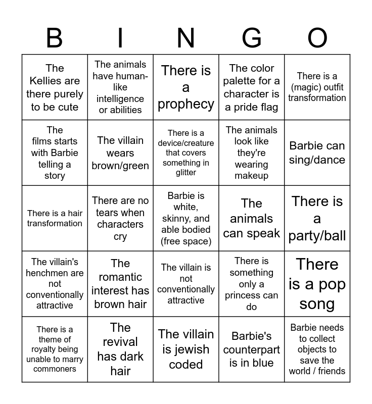 This bingo card has a free space and 24 words: The romantic interest has brown hair, The revival has dark hair, There is a device/creature that covers something in glitter, There is a theme of royalty being unable to marry commoners, There is a (magic) outfit transformation, The Kellies are there purely to be cute, The films starts with Barbie telling a story, The animals have human-like intelligence or abilities, The animals can speak, The villain is not conventionally attractive, The animals look like they're wearing makeup, There is a hair transformation, There is something only a princess can do, There is a pop song, The villain wears brown/green, Barbie's counterpart is in blue, There is a party/ball, There is a prophecy, Barbie can sing/dance, There are no tears when characters cry, Barbie needs to collect objects to save the world / friends, The villain's henchmen are not conventionally attractive, The color palette for a character is a pride flag and The villain is jewish coded.