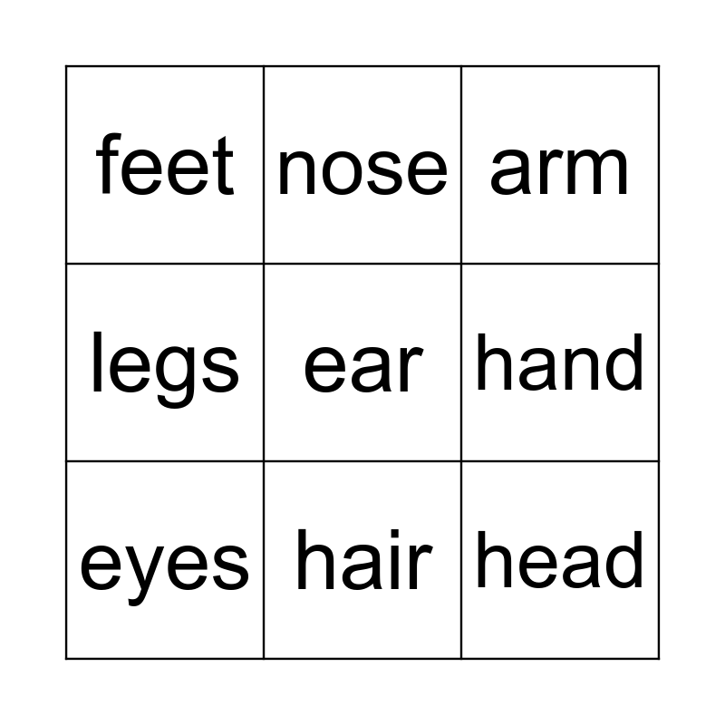 This bingo card has 11 words: head, hair, ear, eyes, nose, arm, hand, finger, legs, feet and mouth.