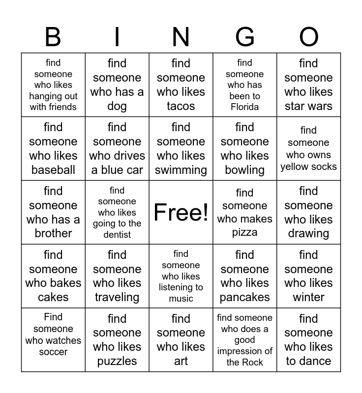 This bingo card has a free space and 29 words: Find someone who watches soccer, Find someone who hates dogs, find someone who likes going to the dentist, find someone who likes seafood, find someone who likes hanging out with friends, find someone who likes tacos, find someone who drives a blue car, find someone who likes traveling, find someone who makes pizza, find someone who likes puzzles, find someone who likes drawing, find someone who likes to dance, find someone who likes art, find someone who does a good impression of the Rock, find someone who owns yellow socks, find someone who likes reading, find someone who likes listening to music, find someone who bakes cakes, find someone who likes star wars, find someone who has a brother, find someone who likes pancakes, find someone who knows at least two bible verses, find someone who likes bowling, find someone who likes baseball, find someone who has been to Florida, find someone who has a dog, find someone who likes winter, find someone who likes swimming and find someone who likes sushi.