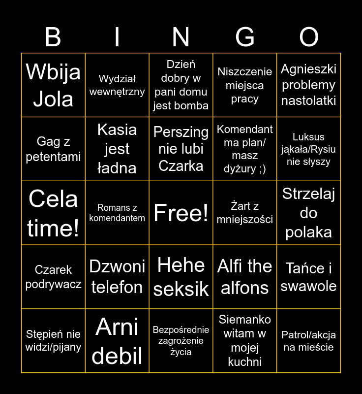 This bingo card has a free space and 24 words: Dzwoni telefon, Arni debil, Perszing nie lubi Czarka, Stępień nie widzi/pijany, Agnieszki problemy nastolatki, Wbija Jola, Gag z petentami, Wydział wewnętrzny, Żart z mniejszości, Hehe seksik, Komendant ma plan/ masz dyżury ;), Cela time!, Alfi the alfons, Tańce i swawole, Kasia jest ładna, Siemanko witam w mojej kuchni, Strzelaj do polaka, Dzień dobry w pani domu jest bomba, Luksus jąkała/Rysiu nie słyszy, Romans z komendantem, Patrol/akcja na mieście, Czarek podrywacz, Niszczenie miejsca pracy and Bezpośrednie zagrożenie życia.