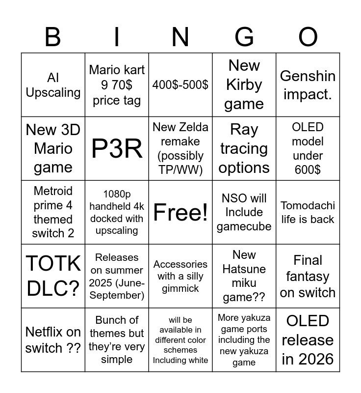 This bingo card has a free space and 24 words: Releases on summer 2025 (June-September), Bunch of themes but they’re very simple, New Zelda remake (possibly TP/WW), Netflix on switch ??, Genshin impact., AI Upscaling, New 3D Mario game, Mario kart 9 70$ price tag, NSO will Include gamecube, Accessories with a silly gimmick, Ray tracing options, Metroid prime 4 themed switch 2, New Hatsune miku game??, Final fantasy on switch, P3R, More yakuza game ports including the new yakuza game, Tomodachi life is back, 400$-500$, OLED model under 600$, 1080p handheld 4k docked with upscaling, OLED release in 2026, TOTK DLC?, New Kirby game and will be available in different color schemes Including white.
