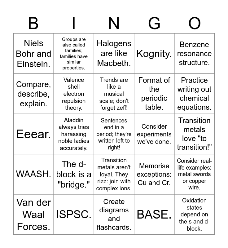 This bingo card has a free space and 24 words: Van der Waal Forces., The d-block is a "bridge.", Trends are like a musical scale; don't forget zeff!, BASE., Benzene resonance structure., Niels Bohr and Einstein., Groups are also called families; families have similar properties., Halogens are like Macbeth., Consider experiments we've done., Transition metals love "to transition!", Eeear., Valence shell electron repulsion theory., Memorise exceptions: Cu and Cr., Consider real-life examples: metal swords or copper wire., Compare, describe, explain., ISPSC., Create diagrams and flashcards., Kognity., Practice writing out chemical equations., WAASH., Aladdin always tries harassing noble ladies accurately., Transition metals aren't loyal. They rizz: join with complex ions., Format of the periodic table. and Oxidation states depend on the s and d-block..