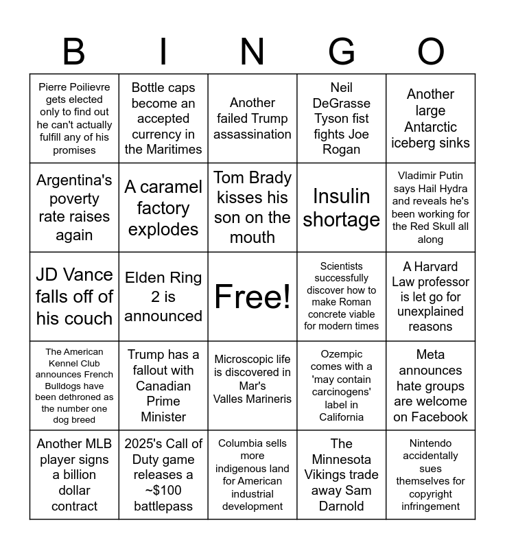 This bingo card has a free space and 24 words: Trump has a fallout with Canadian Prime Minister, 2025's Call of Duty game releases a ~$100 battlepass, Tom Brady kisses his son on the mouth, Another MLB player signs a billion dollar contract, Another large Antarctic iceberg sinks, Pierre Poilievre gets elected only to find out he can't actually fulfill any of his promises, Argentina's poverty rate raises again, Bottle caps become an accepted currency in the Maritimes, Scientists successfully discover how to make Roman concrete viable for modern times, Microscopic life is discovered in Mar's Valles Marineris, Insulin shortage, JD Vance falls off of his couch, Ozempic comes with a 'may contain carcinogens' label in California, Meta announces hate groups are welcome on Facebook, A caramel factory explodes, The Minnesota Vikings trade away Sam Darnold, A Harvard Law professor is let go for unexplained reasons, Another failed Trump assassination, Vladimir Putin says Hail Hydra and reveals he's been working for the Red Skull all along, Elden Ring 2 is announced, Nintendo accidentally sues themselves for copyright infringement, The American Kennel Club announces French Bulldogs have been dethroned as the number one dog breed, Neil DeGrasse Tyson fist fights Joe Rogan and Columbia sells more indigenous land for American industrial development.