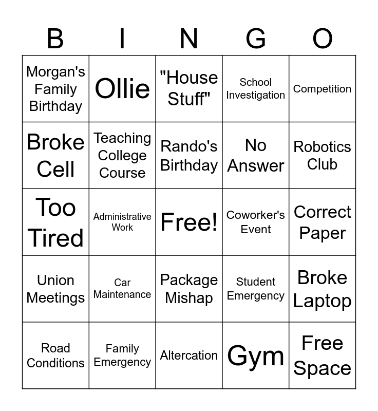 This bingo card has a free space and 24 words: Road Conditions, Car Maintenance, Rando's Birthday, Gym, Competition, Morgan's Family Birthday, Ollie, "House Stuff", Coworker's Event, Correct Paper, Too Tired, Teaching College Course, Student Emergency, Broke Laptop, Broke Cell, Family Emergency, Altercation, School Investigation, Robotics Club, Union Meetings, Administrative Work, Package Mishap, No Answer and Free Space.