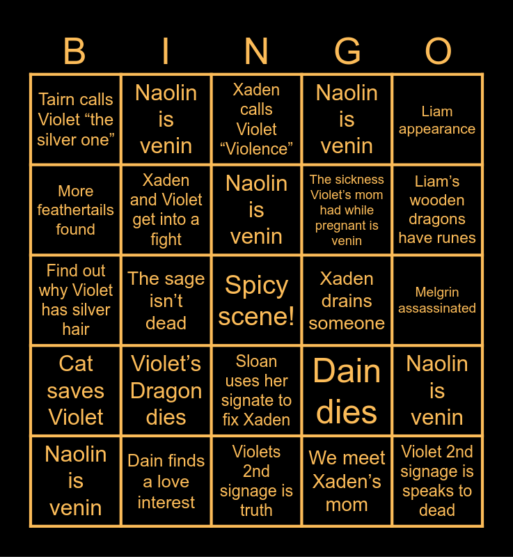 This bingo card has a free space and 29 words: Naolin is venin, Brennan betrays them, The sage isn’t dead, The sage’s ID is revealed, Tairn calls Violet “the silver one”, Xaden calls Violet “Violence”, Xaden and Violet get into a fight, Violet’s Dragon dies, Xaden drains someone, Dain finds a love interest, Melgrin assassinated, Violet 2nd signage is speaks to dead, Violets 2nd signage is truth, We meet Xaden’s mom, Liam’s wooden dragons have runes, Naolin and Brennan were lovers, Sloan uses her signate to fix Xaden, Cat saves Violet, Liam appearance, Find out why Violet has silver hair, Dain dies, Violet finds a Venin cure, The sickness Violet’s mom had while pregnant is venin, More feathertails found, Naolin is venin, Naolin is venin, Naolin is venin, Naolin is venin and Naolin is venin.