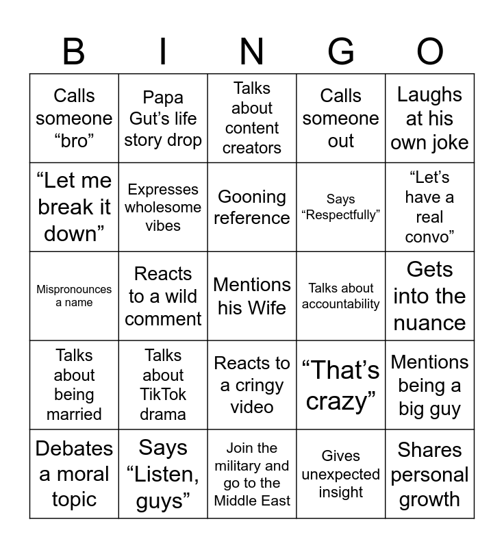This bingo card has a free space and 24 words: Talks about TikTok drama, Says “Listen, guys”, Gooning reference, Debates a moral topic, Laughs at his own joke, Calls someone “bro”, “Let me break it down”, Papa Gut’s life story drop, Talks about accountability, Reacts to a cringy video, Says “Respectfully”, Mispronounces a name, “That’s crazy”, Mentions being a big guy, Expresses wholesome vibes, Gives unexpected insight, Gets into the nuance, Talks about content creators, “Let’s have a real convo”, Reacts to a wild comment, Shares personal growth, Talks about being married, Calls someone out and Join the military and go to the Middle East.