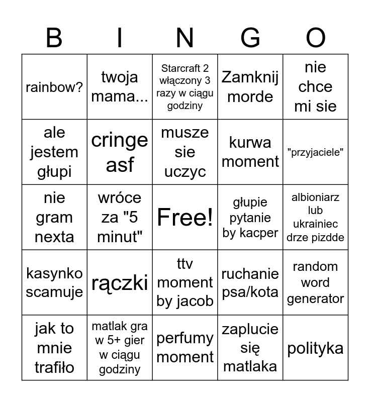 This bingo card has a free space and 24 words: rączki, matlak gra w 5+ gier w ciągu godziny, musze sie uczyc, jak to mnie trafiło, nie chce mi sie, rainbow?, ale jestem głupi, twoja mama..., głupie pytanie by kacper, ttv moment by jacob, kurwa moment, nie gram nexta, ruchanie psa/kota, random word generator, cringe asf, zaplucie się matlaka, albioniarz lub ukrainiec drze pizdde, Starcraft 2 włączony 3 razy w ciągu godziny, "przyjaciele", wróce za "5 minut", polityka, kasynko scamuje, Zamknij morde and perfumy moment.