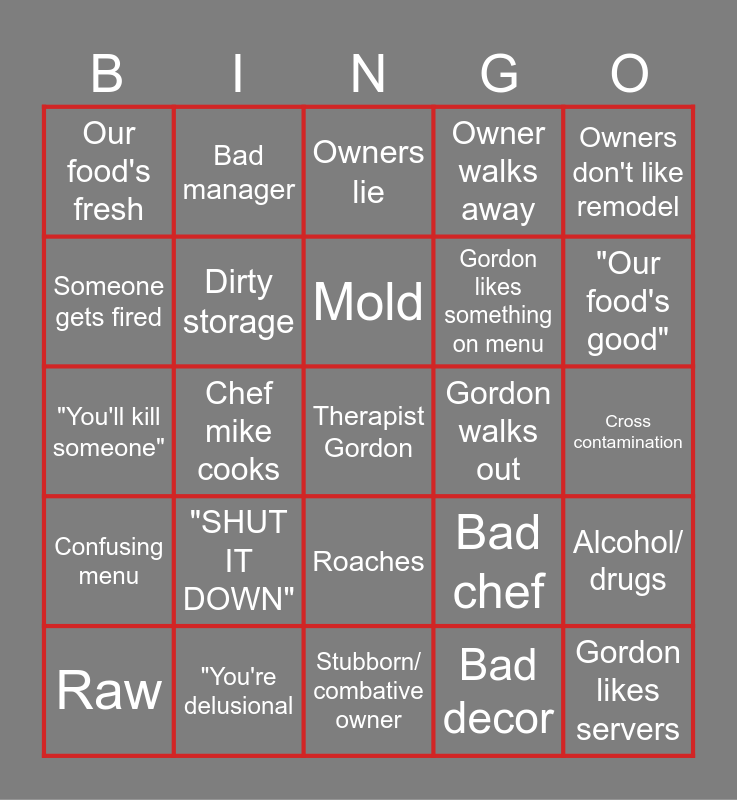 This bingo card has a free space and 29 words: Raw, Fresh frozen, Chef mike cooks, Large menu, Our food's fresh, Owners lie, Dirty storage, "SHUT IT DOWN", Gordon walks out, "You're delusional, Cross contamination, Gordon likes servers, Stubborn/ combative owner, Bad decor, "Our food's good", Owner fights with Gordon, Roaches, Confusing menu, Owners don't like remodel, "You'll kill someone", Bad chef, Dead animals, Gordon likes something on menu, Someone gets fired, Owner walks away, Bad manager, Alcohol/ drugs, Mold and Angry staff.