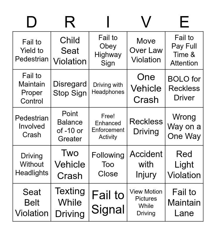 This bingo card has a free space and 24 words: Two Vehicle Crash, Texting While Driving, Driving with Headphones, Seat Belt Violation, Fail to Pay Full Time & Attention, Fail to Yield to Pedestrian, Fail to Maintain Proper Control, Child Seat Violation, Reckless Driving, Following Too Close, One Vehicle Crash, Pedestrian Involved Crash, Accident with Injury, Red Light Violation, Disregard Stop Sign, View Motion Pictures While Driving, Wrong Way on a One Way, Fail to Obey Highway Sign, BOLO for Reckless Driver, Point Balance of -10 or Greater, Fail to Maintain Lane, Driving Without Headlights, Move Over Law Violation and Fail to Signal.