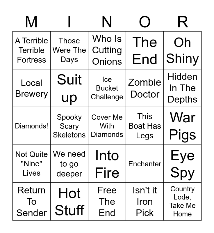 This bingo card has a free space and 24 words: We need to go deeper, Hot Stuff, Ice Bucket Challenge, Return To Sender, Oh Shiny, A Terrible Terrible Fortress, Local Brewery, Those Were The Days, This Boat Has Legs, Into Fire, Zombie Doctor, Diamonds!, Enchanter, Eye Spy, Suit up, Isn't it Iron Pick, War Pigs, Who Is Cutting Onions, Hidden In The Depths, Spooky Scary Skeletons, Country Lode, Take Me Home, Not Quite "Nine" Lives, The End and Free The End.