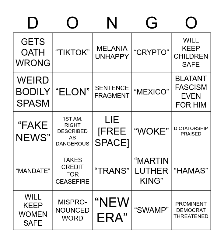 This bingo card has a free space and 24 words: TAKES CREDIT FOR CEASEFIRE, MISPRO- NOUNCED WORD, SENTENCE FRAGMENT, WILL KEEP WOMEN SAFE, WILL KEEP CHILDREN SAFE, GETS OATH WRONG, WEIRD BODILY SPASM, “TIKTOK”, “WOKE”, “TRANS”, “MEXICO”, “FAKE NEWS”, “MARTIN LUTHER KING”, “HAMAS”, “ELON”, “SWAMP”, DICTATORSHIP PRAISED, MELANIA UNHAPPY, BLATANT FASCISM EVEN FOR HIM, 1ST AM. RIGHT DESCRIBED AS DANGEROUS, PROMINENT DEMOCRAT THREATENED, “MANDATE”, “CRYPTO” and “NEW ERA”.
