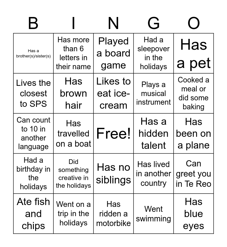 This bingo card has a free space and 24 words: Did something creative in the holidays, Went on a trip in the holidays, Likes to eat ice-cream, Ate fish and chips, Has a pet, Has a brother(s)/sister(s), Lives the closest to SPS, Has more than 6 letters in their name, Has a hidden talent, Has no siblings, Plays a musical instrument, Can count to 10 in another language, Has lived in another country, Can greet you in Te Reo, Has brown hair, Went swimming, Has been on a plane, Played a board game, Cooked a meal or did some baking, Has travelled on a boat, Has blue eyes, Had a birthday in the holidays, Had a sleepover in the holidays and Has ridden a motorbike.
