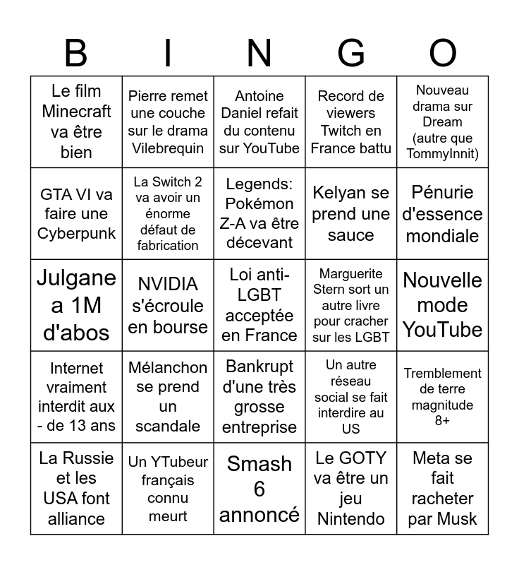 This bingo card has a free space and 24 words: Mélanchon se prend un scandale, Un YTubeur français connu meurt, Legends: Pokémon Z-A va être décevant, La Russie et les USA font alliance, Nouveau drama sur Dream (autre que TommyInnit), Le film Minecraft va être bien, GTA VI va faire une Cyberpunk, Pierre remet une couche sur le drama Vilebrequin, Marguerite Stern sort un autre livre pour cracher sur les LGBT, Bankrupt d'une très grosse entreprise, Kelyan se prend une sauce, Julgane a 1M d'abos, Un autre réseau social se fait interdire au US, Tremblement de terre magnitude 8+, La Switch 2 va avoir un énorme défaut de fabrication, Le GOTY va être un jeu Nintendo, Nouvelle mode YouTube, Antoine Daniel refait du contenu sur YouTube, Pénurie d'essence mondiale, NVIDIA s'écroule en bourse, Meta se fait racheter par Musk, Internet vraiment interdit aux - de 13 ans, Record de viewers Twitch en France battu and Smash 6 annoncé.