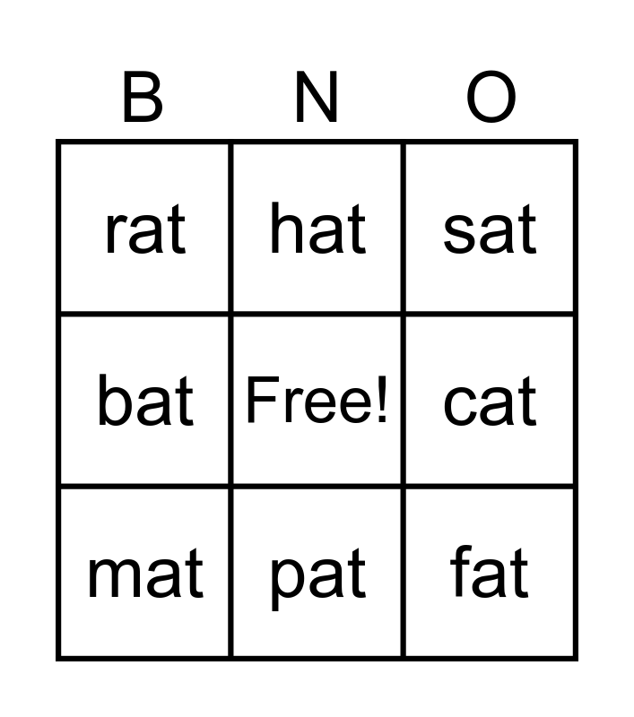 This bingo card has a free space and 8 words: cat, sat, hat, mat, rat, fat, bat and pat.