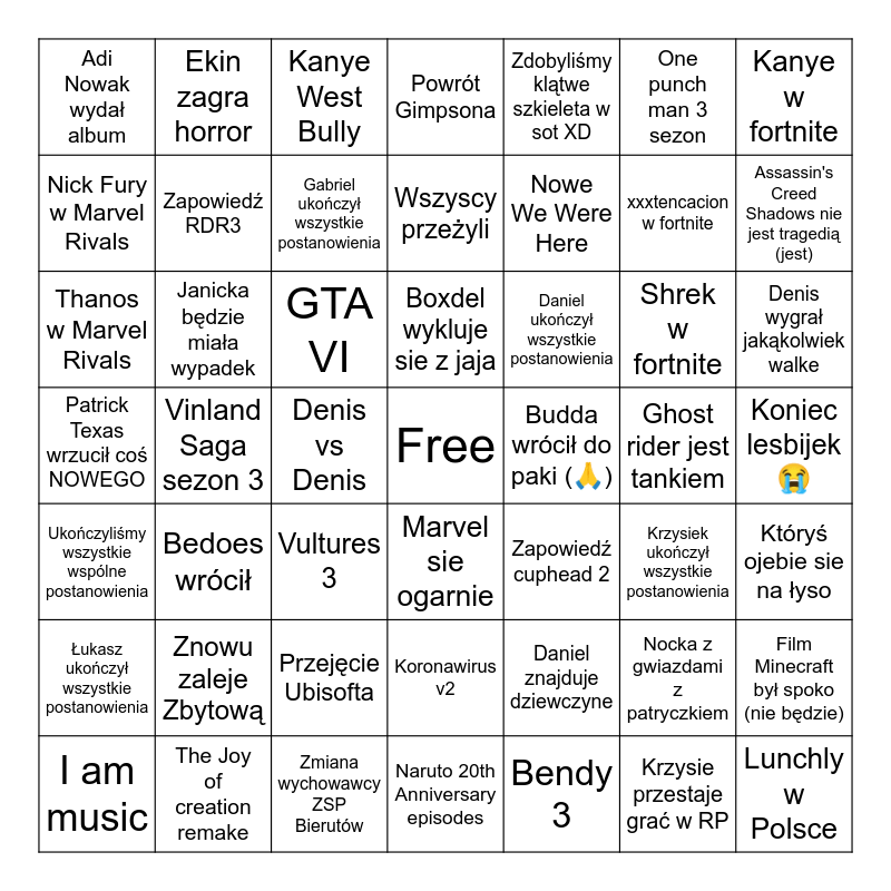 This bingo card has a free space and 48 words: Daniel znajduje dziewczyne, xxxtencacion w fortnite, Naruto 20th Anniversary episodes, Vinland Saga sezon 3, GTA VI, Koniec lesbijek馃槶, Ekin zagra horror, The Joy of creation remake, One punch man 3 sezon, Marvel sie ogarnie, Kanye w fortnite, Powr贸t Gimpsona, Shrek w fortnite, Daniel uko艅czy艂 wszystkie postanowienia, 艁ukasz uko艅czy艂 wszystkie postanowienia, Ghost rider jest tankiem, Nick Fury w Marvel Rivals, Assassin's Creed Shadows nie jest tragedi膮 (jest), Nocka z gwiazdami z patryczkiem, Zdobyli艣my kl膮twe szkieleta w sot XD, Nowe We Were Here, Denis vs Denis, Adi Nowak wyda艂 album, Zapowied藕 RDR3, Film Minecraft by艂 spoko (nie b臋dzie), Gabriel uko艅czy艂 wszystkie postanowienia, Denis wygra艂 jak膮kolwiek walke, I am music, Boxdel wykluje sie z jaja, Janicka b臋dzie mia艂a wypadek, Krzysie przestaje gra膰 w RP, Budda wr贸ci艂 do paki (馃檹), Kt贸ry艣 ojebie sie na 艂yso, Znowu zaleje Zbytow膮, Patrick Texas wrzuci艂 co艣 NOWEGO, Zapowied藕 cuphead 2, Krzysiek uko艅czy艂 wszystkie postanowienia, Thanos w Marvel Rivals, Vultures 3, Przej臋cie Ubisofta, Uko艅czyli艣my wszystkie wsp贸lne postanowienia, Lunchly w Polsce, Kanye West Bully, Zmiana wychowawcy ZSP Bierut贸w, Wszyscy prze偶yli, Koronawirus v2, Bedoes wr贸ci艂 and Bendy 3.