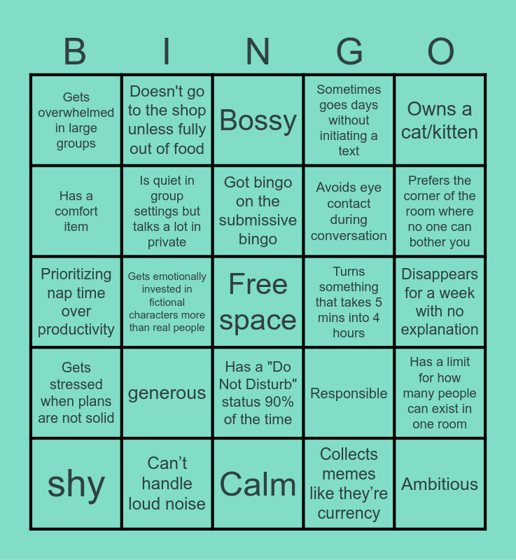 This bingo card has a free space and 37 words: Prefers texting over phone calls, Gets more excited about canceling plans than making them, Needs a lot of alone time after hanging out with friends, Turns something that takes 5 mins into 4 hours, Disappears for a week with no explanation, Gets stressed when plans are not solid, Gets emotionally invested in fictional characters more than real people, Has a specific friend that doesn't drain their social battery, Avoids eye contact during conversation, Has no idea how to contribute to a conversation after a certain point, Has a comfort item, Is quiet in group settings but talks a lot in private, Collects memes like they’re currency, Owns a cat/kitten, Gets overwhelmed in large groups, Can’t handle loud noise, Has a "Do Not Disturb" status 90% of the time, Sometimes goes days without initiating a text, Prefers the corner of the room where no one can bother you, Prioritizing nap time over productivity, Doesn't go to the shop unless fully out of food, Got bingo on the submissive bingo, Gets emotionally invested in fictional characters more than real people, Has a limit for how many people can exist in one room, Reserved, Outgoing, Bossy, Selfish, Cheerful, Indifferent, Helpful, Calm, Responsible, Ambitious, shy, generous and introvert.