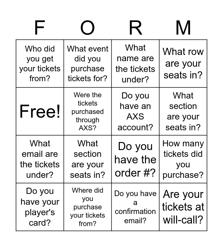 This bingo card has 16 words: Where did you purchase your tickets from?, How many tickets did you purchase?, What name are the tickets under?, Who did you get your tickets from?, What email are the tickets under?, What event did you purchase tickets for?, Do you have the order #?, Do you have a confirmation email?, Free!, Were the tickets purchased through AXS?, Do you have your player's card?, What row are your seats in?, What section are your seats in?, What section are your seats in?, Do you have an AXS account? and Are your tickets at will-call?.