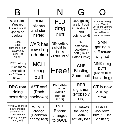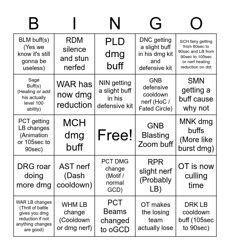 This bingo card has a free space and 24 words: AST nerf (Dash cooldown), WHM LB change (Cooldown or dmg nerf), NIN getting a slight buff in his defensive kit, WAR LB changes (Thrill of battle gives you dmg reduction if not anything changes are good), SCH fairy getting from 60sec to 90sec and LB from 90sec to 105sec or nerf healing reduction on dot, BLM buff(s) (Yes we know it's still gonna be useless), Sage Buff(s) (Healing or add his actually level 100 ability), RDM silence and stun nerfed, GNB Blasting Zoom buff, PCT DMG change (Motif / normal GCD), GNB defensive cooldown nerf (HoC / Fated Circle), PCT getting LB changes (Animation or 105sec to 90sec), RPR slight nerf (Probably LB), OT is now culling time, WAR has now dmg reduction, OT makes the losing team actually lose, MNK dmg buffs (More like burst dmg), PLD dmg buff, SMN getting a buff cause why not, MCH dmg buff, DRK LB cooldown buff (105sec to 90sec), DRG roar doing more dmg, DNC getting a slight buff in his dmg kit and defensive kit and PCT Beams changed to oGCD.