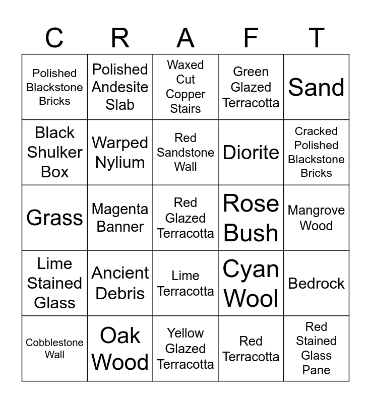 This bingo card has 807 words: Stone, Granite, Polished Granite, Diorite, Polished Diorite, Andesite, Polished Andesite, Deepslate, Cobbled Deepslate, Polished Deepslate, Calcite, Tuff, Dripstone Block, Grass Block, Dirt, Coarse Dirt, Podzol, Rooted Dirt, Mud, Crimsom Nylium, Warped Nylium, Cobblestone, Oak Planks, Spruce Planks, Birch Planks, Jungle Planks, Acacia Planks, Dark Oak Planks, Mangrove Planks, Crimsom Planks, Warped Planks, Oak Sapling, Spruce Sapling, Birch Sapling, Jungle Sapling, Acacia Sapling, Dark Oak Sapling, Mangrove Propagule, Sand, Red Sand, Gravel, Coal Ore, Deepslate Coal Ore, Iron Ore, Deepslate Iron Ore, Copper Ore, Deepslate Copper Ore, Gold Ore, Deepslate Gold Ore, Redstone Ore, Deepslate Redstone Ore, Emerald Ore, Deepslate Emerald Ore, Lapis Lazuli Ore, Deepslate Lapis Lazuli Ore, Diamond Ore, Deepslate Diamond Ore, Nether Gold Ore, Nether Quartz Ore, Ancient Debris, Block of Coal, Block of Raw Iron, Block of Raw Copper, Block of Raw Gold, Block of Amethyst, Block of Iron, Block of Copper, Block of Gold, Block of Diamond, Block of Netherite, Exposed Copper, Weathered Copper, Oxidized Copper, Cut Copper, Exposed Cut Copper, Weathered Cut Copper, Oxidized Cut Copper, Cut Copper Stairs, Exposed Cut Copper Stairs, Weathered Cut Copper Stairs, Oxidized Cut Copper Stairs, Cut Copper Slab, Exposed Cut Copper Slab, Weathered Cut Copper Slab, Oxidized Cut Copper Slab, Waxed Block of Copper, Waxed Exposed Copper, Waxed Weathered Copper, Waxed Oxidized Copper, Waxed Cut Copper, Waxed Exposed Cut Copper, Waxed Weathered Cut Copper, Waxed Oxidized Cut Copper, Waxed Cut Copper Stairs, Waxed Exposed Cut Copper Stairs, Waxed Weathered Cut Copper Stairs, Waxed Oxidized Cut Copper Stairs, Waxed Cut Copper Slab, Waxed Exposed Cut Copper Slab, Waxed Weathered Cut Copper Slab, Waxed Oxidized Cut Copper Slab, Oak Log, Spruce Log, Birch Log, Jungle Log, Acacia Log, Dark Oak Log, Mangrove Log, Mangrove Roots, Muddy Mangrove Roots, Crimsom Stem, Warped Stem, Stripped Oak Log, Stripped Spruce Log, Stripped Birch Log, Stripped Jungle Log, Stripped Acacia Log, Stripped Dark Oak Log, Stripped Mangrove Log, Stripped Crimsom Stem, Stripped Warped Stem, Stripped Oak Wood, Stripped Spruce Wood, Stripped Birch Wood, Stripped Jungle Wood, Stripped Acacia Wood, Stripped Dark Oak Wood, Stripped Mangrove Wood, Stripped Crimsom Hyphae, Oak Wood, Spruce Wood, Birch Wood, Jungle Wood, Acacia Wood, Dark Oak Wood, Mangrove Wood, Crimsom Hyphae, Warped Hyphae, Oak Leaves, Spruce Leaves, Birch Leaves, Jungle Leaves, Acacia Leaves, Dark Oak Leaves, Mangrove Leaves, Azalea Leaves, Flowering Azalea Leaves, Sponge, Wet Sponge, Glass, Tinted Glass, Block of Lapis Lazuli, Sandstone, Chiseled Sandstone, Cut Sandstone, Cobweb, Grass, Fern, Azalea, Flowering Azalea, Dead Bush, Sea Grass, Sea Pickle, White Wool, Orange Wool, Magenta Wool, Light Blue Wool, Yellow Wool, Lime Wool, Pink Wool, Gray Wool, Light Gray Wool, Cyan Wool, Purple Wool, Blue Wool, Brown Wool, Green Wool, Red Wool, Black Wool, Dandelion, Poppy, Blue Orchid, Allium, Azure Bluet, Red Tulip, Orange Tulip, White Tulip, Pink Tulip, Oxeye Daisy, Cornflower, Lily of the Valey, Wither Rose, Spore Blassom, Brown Mushroom, Red Mushroom, Crimsom Fungus, Warped Fungus, Crimsom Roots, Warped Roots, Nether Sprouts, Weeping Vines, Twisting Vines, Sugar Cane, Kelp, Moss Carpet, Moss Block, Hanging Roots, Big Dripleaf, Small Dripleaf, Bamboo, Oak Slab, Spruce Slab, Birch Slab, Jungle Slab, Acacia Slab, Dark Oak Slab, Mangrove Slab, Crimson Slab, Warped Slab, Stone Slab, Smooth Stone Slab, Sandstone Slab, Cut Sandstone Slab, Cobblestone Slab, Brick Slab, Stone Brick Slab, Mud Brick Slab, Nether Brick Slab, Quartz Slab, Red Sandstone Slab, Cut Red Sandstone Slab, Purpur Slab, Prismarine Slab, Prismarine Brick Slab, Dark Prismarine Slab, Smooth Quartz Block, Smooth Red Sandstone, Smooth Sandstone, Smooth Stone, Bricks, Bookshelf, Mossy Cobblestone, Obsidian, Torch, End Rod, Chorus Flower, Purpur Block, Purpur Pillar, Purpur Stairs, Chest, Crafting Table, Furnace, Ladder, Cobblestone Stairs, Snow, Ice, Snow Block, Cactus, Clay, Jukebox, Oak Fence, Spruce Fence, Birch Fence, Jungle Fence, Acacia Fence, Dark Oak Fence, Mangrove Fence, Crimson Fence, Warped Fence, Pumpkin, Carved Pumpkin, Jack o'Lantern, Netherrack, Soul Sand, Soul Soil, Basalt, Polished Basalt, Smooth Basalt, Soul Torch, Glowstone, Stone Bricks, Mossy Stone Bricks, Cracked Stone Bricks, Chiseled Stone Bricks, Packed Mud, Mud Bricks, Deepslate Bricks, Cracked Deepslate Bricks, Deepslate Tiles, Cracked Deepslate Tiles, Chiseled Deepslate, Brown Mushroom Block, Red Mushroom Block, Mushroom Stem, Iron Bars, Chain, Glass Pane, Melon, Vines, Glow Lichen, Brick Stairs, Stone Brick Stairs, Mud Brick Stairs, Mycelium, Lily Pad, Nether Bricks, Cracked Nether Bricks, Chiseled Nether Bricks, Nether Brick Fence, Nether Brick Stairs, Sculk, Sculk Vein, Sculk Catalyst, Sculk Shrieker, Enchanting Table, End Stone, End Stone Bricks, Dragon Egg, Sandstone Stairs, Ender Chest, Block of Emerald, Oak Stairs, Spruce Stairs, Birch Stairs, Jungle Stairs, Acacia Stairs, Dark Oak Stairs, Mangrove Stairs, Crimson Stairs, Warped Stairs, Beacon, Cobblestone Wall, Mossy Cobblestone Wall, Brick Wall, Prismarine Wall, Red Sandstone Wall, Mossy Stone Brick Wall, Granite Wall, Stone Brick Wall, Mud Brick Wall, Nether Brick Wall, Andesite Wall, Red Nether Brick Wall, Sandstone Wall, End Stone Brick Wall, Diorite Wall, Blackstone Wall, Polished Blackstone Wall, Polished Blackstone Brick Wall, Cobbled Deepslate Wall, Polished Deepslate Wall, Deepslate Brick Wall, Deepslate Tile Wall, Anvil, Chipped Anvil, Damaged Anvil, Chiseled Quartz Block, Block of Quartz, Quartz Bricks, Quartz Pillar, Quartz Stairs, White Terracotta, Orange Terracotta, Magenta Terracota, Light Blue Terracotta, Yellow Terracotta, Lime Terracotta, Pink Terracota, Gray Terracotta, Light Gray Terracotta, Cyan Terracotta, Purple Terracotta, Blue Terracotta, Brown Terr