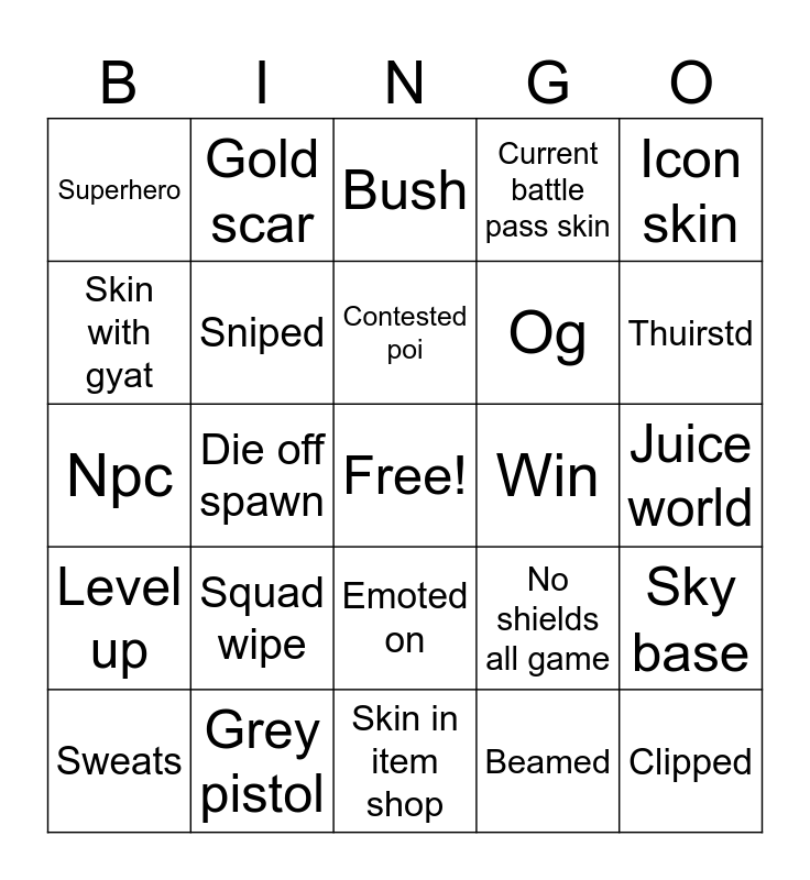 This bingo card has a free space and 24 words: Squad wipe, Grey pistol, Contested poi, Sweats, Icon skin, Superhero, Skin with gyat, Gold scar, Win, Emoted on, Og, Npc, No shields all game, Sky base, Sniped, Beamed, Juice world, Bush, Thuirstd, Die off spawn, Clipped, Level up, Current battle pass skin and Skin in item shop.
