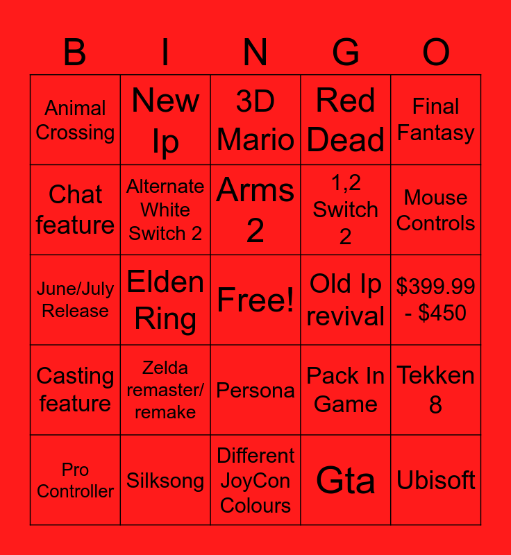 This bingo card has a free space and 24 words: Zelda remaster/ remake, Silksong, Arms 2, Pro Controller, Final Fantasy, Animal Crossing, Chat feature, New Ip, Old Ip revival, Persona, 1,2 Switch 2, June/July Release, Pack In Game, Tekken 8, Alternate White Switch 2, Gta, $399.99 - $450, 3D Mario, Mouse Controls, Elden Ring, Ubisoft, Casting feature, Red Dead and Different JoyCon Colours.