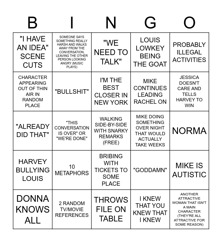 This bingo card has a free space and 24 words: 10 METAPHORS, 2 RANDOM TV/MOVIE REFERENCES, I'M THE BEST CLOSER IN NEW YORK, DONNA KNOWS ALL, PROBABLY ILLEGAL ACTIVITIES, "I HAVE AN IDEA" SCENE CUTS, CHARACTER APPEARING OUT OF THIN AIR IN RANDOM PLACE, SOMEONE SAYS SOMETHING REALLY HARSH AND WALKS AWAY FROM THE CONVERSATION, LEAVING THE OTHER PERSON LOOKING ANGRY (MUSIC PLAYS), MIKE DOING SOMETHING OVER NIGHT THAT WOULD ACTUALLY TAKE WEEKS, BRIBING WITH TICKETS TO SOME PLACE, MIKE CONTINUES LEADING RACHEL ON, "ALREADY DID THAT", "GODDAMN", MIKE IS AUTISTIC, "BULLSHIT", I KNEW THAT YOU KNEW THAT I KNEW, NORMA, "WE NEED TO TALK", JESSICA DOESN'T CARE AND TELLS HARVEY TO WIN, "THIS CONVERSATION IS OVER" OR "WE'RE DONE", ANOTHER ATTRACTIVE WOMAN THAT ISN'T A MAIN CHARACTER (THEY'RE ALL ATTRACTIVE FOR SOME REASON), HARVEY BULLYING LOUIS, LOUIS LOWKEY BEING THE GOAT and THROWS FILE ON TABLE.