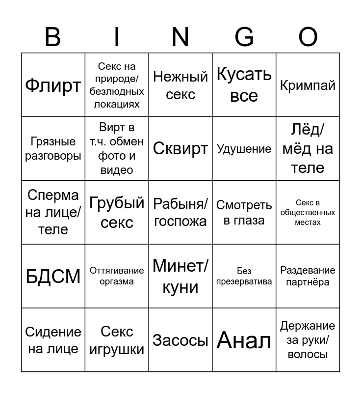 This bingo card has a free space and 24 words: Оттягивание оргазма, Секс игрушки, Сквирт, Сидение на лице, Кримпай, Флирт, Грязные разговоры, Секс на природе/безлюдных локациях, Смотреть в глаза, Минет/куни, Удушение, Сперма на лице/теле, Без презерватива, Раздевание партнёра, Вирт в т.ч. обмен фото и видео, Анал, Секс в общественных местах, Нежный секс, Лёд/мёд на теле, Грубый секс, Держание за руки/волосы, БДСМ, Кусать все and Засосы.