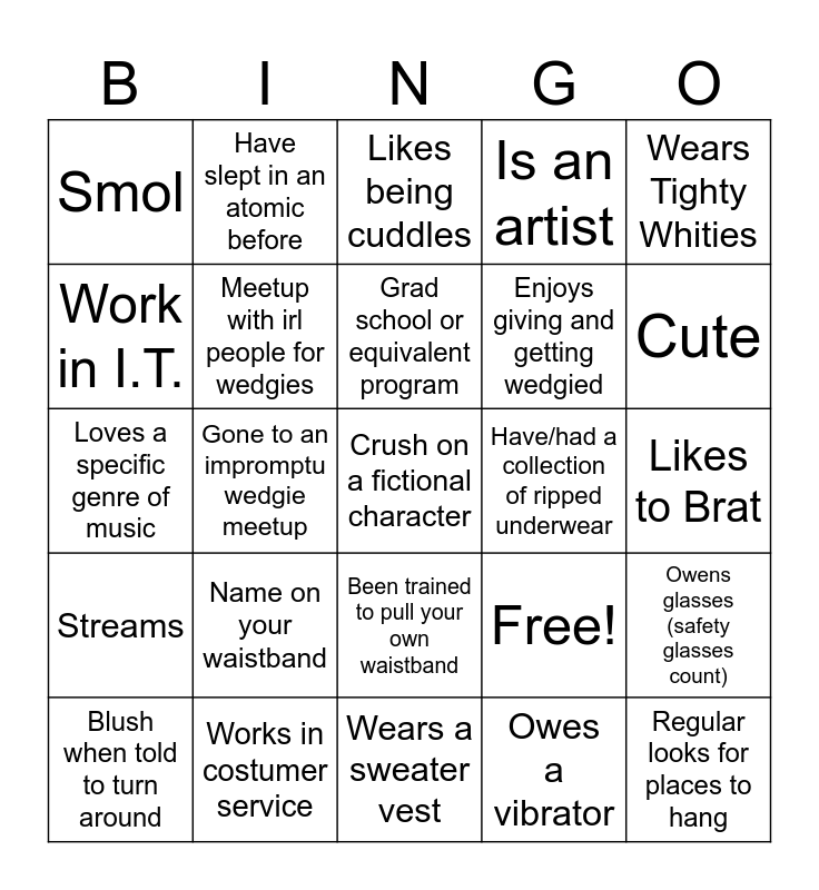 This bingo card has 25 words: Name on your waistband, Wears a sweater vest, Grad school or equivalent program, Blush when told to turn around, Wears Tighty Whities, Smol, Work in I.T., Have slept in an atomic before, Have/had a collection of ripped underwear, Been trained to pull your own waistband, Enjoys giving and getting wedgied, Loves a specific genre of music, Free!, Owens glasses (safety glasses count), Meetup with irl people for wedgies, Regular looks for places to hang, Likes to Brat, Likes being cuddles, Cute, Gone to an impromptu wedgie meetup, Crush on a fictional character, Works in costumer service, Streams, Is an artist and Owes a vibrator.