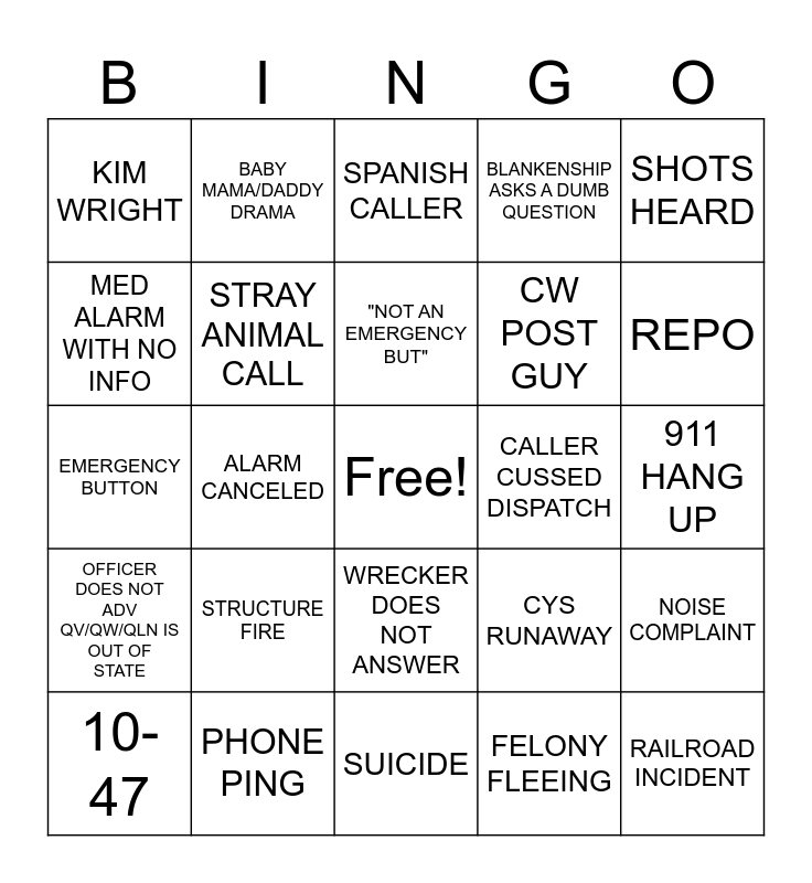This bingo card has a free space and 24 words: 10-47, STRUCTURE FIRE, "NOT AN EMERGENCY BUT", FELONY FLEEING, SHOTS HEARD, KIM WRIGHT, BABY MAMA/DADDY DRAMA, SPANISH CALLER, CALLER CUSSED DISPATCH, 911 HANG UP, EMERGENCY BUTTON, STRAY ANIMAL CALL, CYS RUNAWAY, NOISE COMPLAINT, MED ALARM WITH NO INFO, PHONE PING, SUICIDE, BLANKENSHIP ASKS A DUMB QUESTION, REPO, OFFICER DOES NOT ADV QV/QW/QLN IS OUT OF STATE, ALARM CANCELED, WRECKER DOES NOT ANSWER, CW POST GUY and RAILROAD INCIDENT.