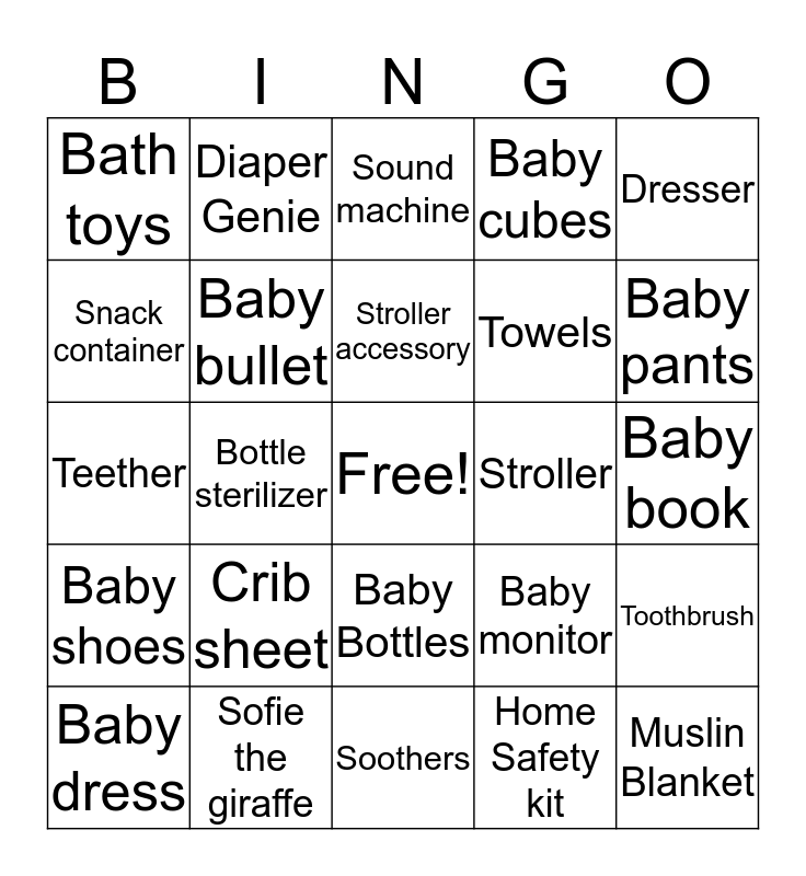 This bingo card has a free space and 47 words: Baby pj's/sleeper, Muslin Blanket, Baby Socks, Soothers, Crib sheet, Diaper Bag, Diaper Genie, Spoons, Snack container, Humidifier, Baby bullet, Baby cubes, Toothbrush, Baby monitor, Gift card, Baby mirror, Stroller accessory, Stroller, Crib, Dresser, Bottle sterilizer, Home Safety kit, Bath toys, Towels, Baby Hat, Baby pants, Baby dress, Baby bottle warmer, Baby Bottles, Baby shoes, Diaper Genie refills, Travel diaper genie, Diaper cream, Mobile, Washcloths, Sofie the giraffe, Baby book, Gift card, Baby soap, Nail trimmers, Bottle drying rack, Sound machine, Teether, Hangers, Baby body suits, Bib and Travel crib.