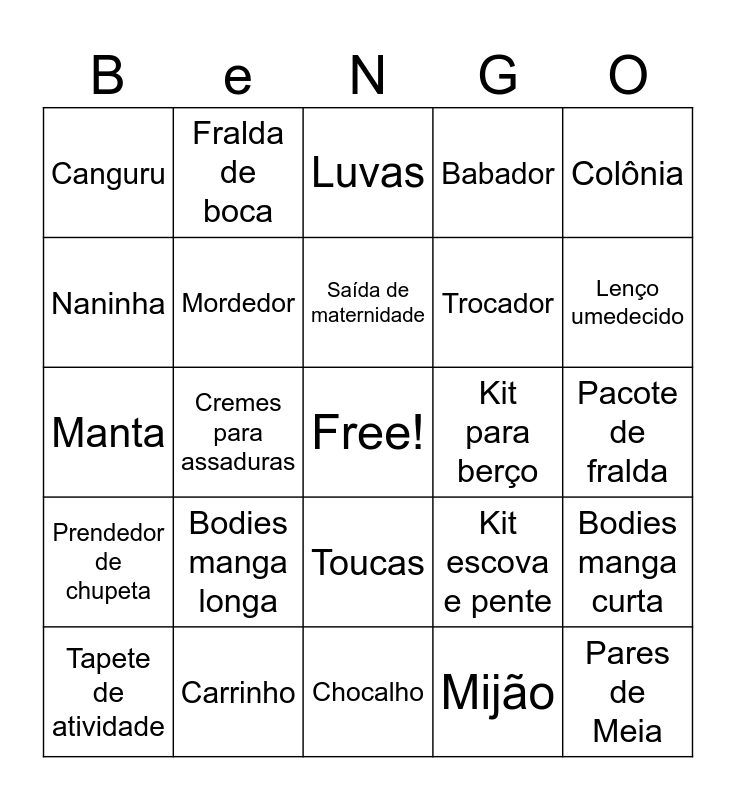 This bingo card has a free space and 42 words: Segue opções, Saída de maternidade, Macacão, Bodies manga longa, Mijão, Bodies manga curta, Pares de Meia, Sapatinho, Luvas, Toucas, Pacote de fralda, Lenço umedecido, Cremes para assaduras, Colônia, Kit shampoo e condicionador, Kit escova e pente, Kit mamadeira, Manta, Cueiro mosqueteiro, Fralda de boca, Naninha, Babá eletrônica, Bebê conforto, Canguru, Espelho retrovisor para carro, Frasqueira, Trocador, Banheira, Aspirador nasal, Termômetro, Lixeira, Prendedor de chupeta, Mordedor, Chocalho, Chupeta, Tapete de atividade, Carrinho, Kit para berço, Cobertor, Pagão, Babador and Paninho de boca.