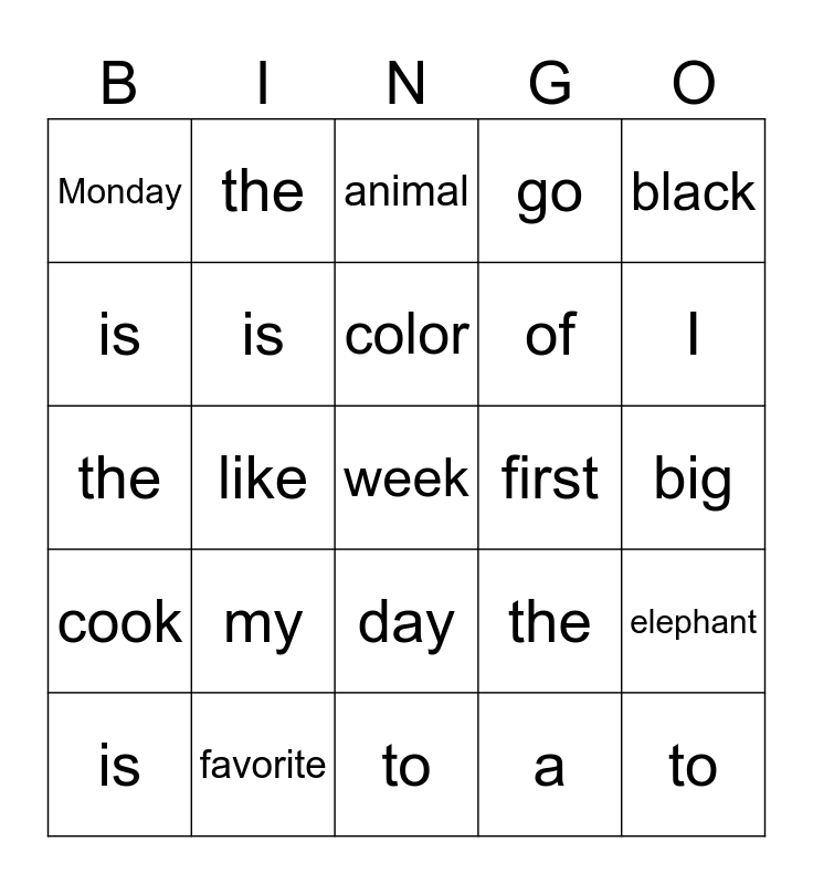 This bingo card has a free space and 24 words: my, favorite, color, is, black, Monday, is, the, first, day, of, the, the, elephant, is, a, big, animal, I, like, to, cook, go and to.