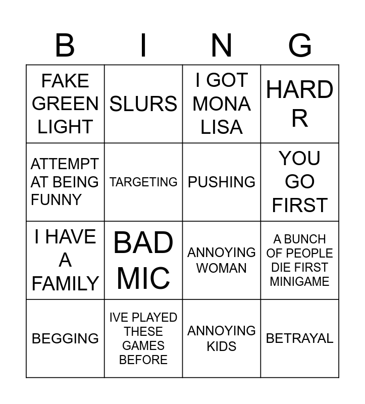 This bingo card has 16 words: IVE PLAYED THESE GAMES BEFORE, A BUNCH OF PEOPLE DIE FIRST MINIGAME, I GOT MONA LISA, FAKE GREEN LIGHT, I HAVE A FAMILY, SLURS, ANNOYING WOMAN, ANNOYING KIDS, ATTEMPT AT BEING FUNNY, TARGETING, BEGGING, HARD R, BAD MIC, YOU GO FIRST, PUSHING and BETRAYAL.